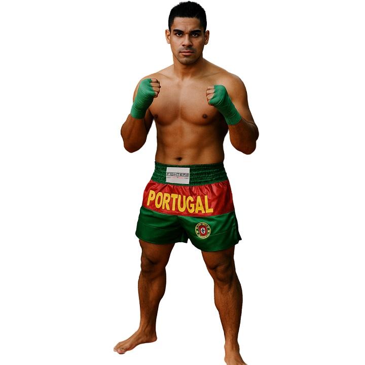 Short de boxe Thai / kick de haute qualité en satin. Excellente finition (fait main, satin fin). Short rayé vert/rouge avec la crête de Portugal et l'inscription PORTUGAL. Avec large ceinture élastique, fentes latérales et laçage à l'intérieur pour un ajustement parfait. Coupe spéciale pour les coups de pied haut et knee kicks.