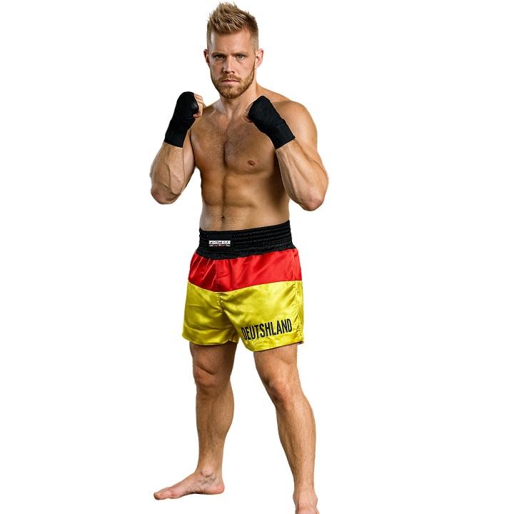Short de boxe Thai / kick de haute qualité en satin. Excellente finition (fait main, satin fin). Short rayé noir - rouge - jaune avec caractères DEUTSCHLAND sur la jambe gauche. Avec large ceinture élastique, fentes latérales et laçage à l'intérieur pour un ajustement parfait. Coupe spéciale pour les coups de pied haut et knee kicks.